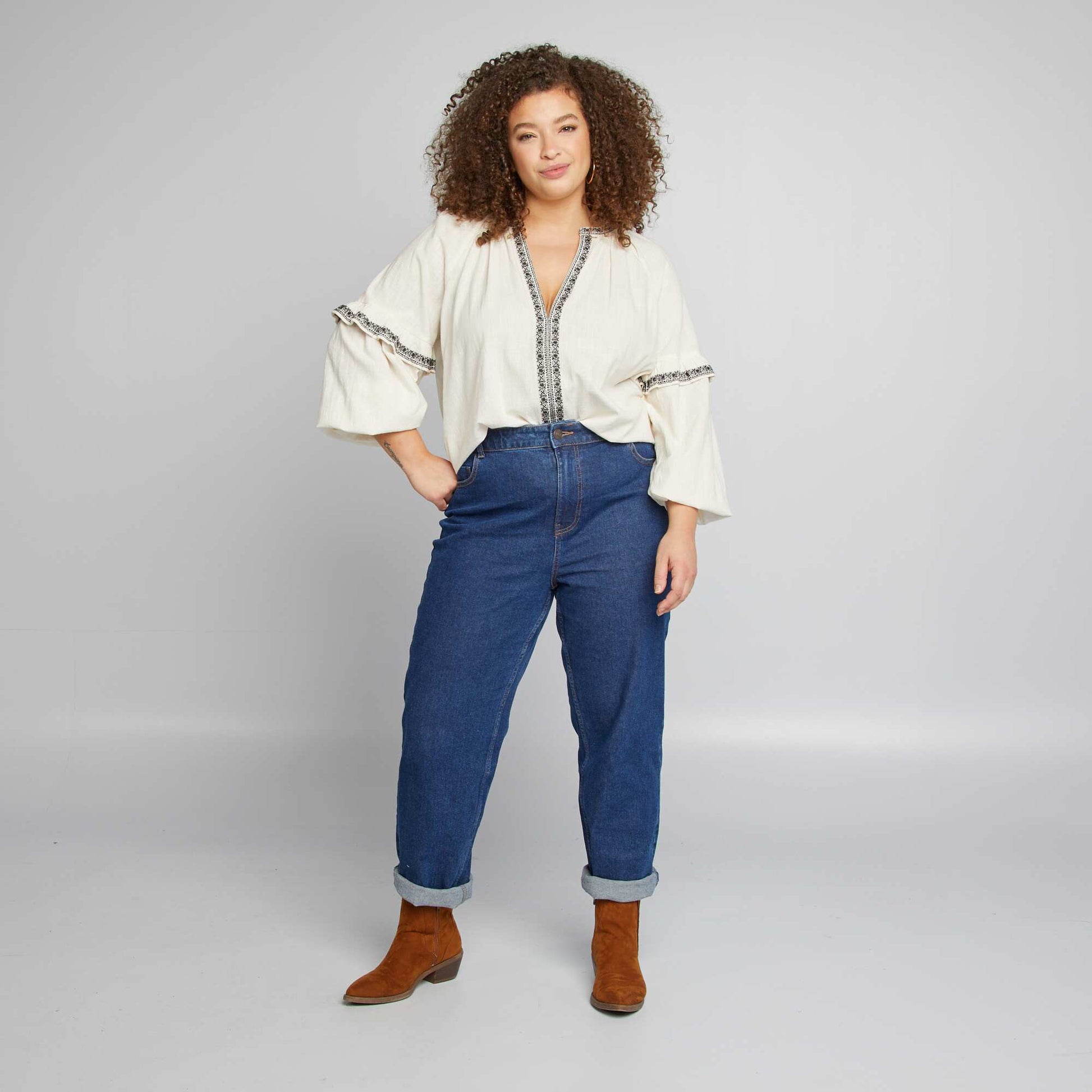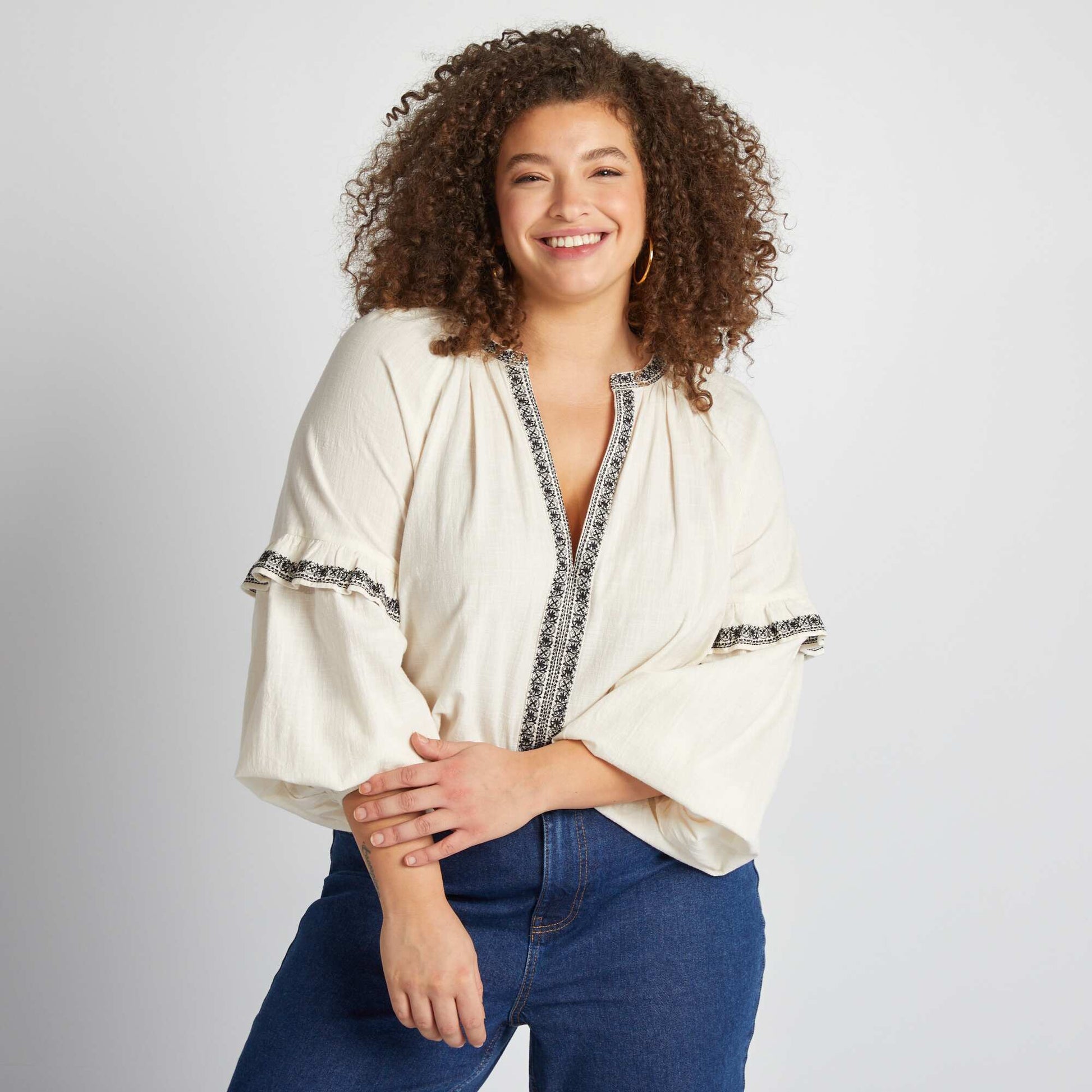 Cotton gauze blouse with embroidered patterns BEIGE